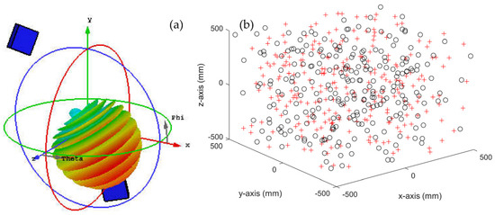 (a) The radiated emission patterns of two devices with different locations and orientations. (b) The randomly assumed locations of the two devices inside the cubical volume. Red pluses and black circles show the arbitrary locations.