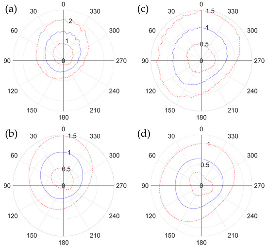 The radiated emission (in V/m) in plane (a) from two uncorrelated microstrip antennas and (b) from one microstrip antenna. The radiated emission (in V/m) in plane (c) from two uncorrelated microstrip antennas and (d) from one microstrip antenna. Blue curves show the mean value and the red dashed curves show the mean value plus and minus the standard deviation.