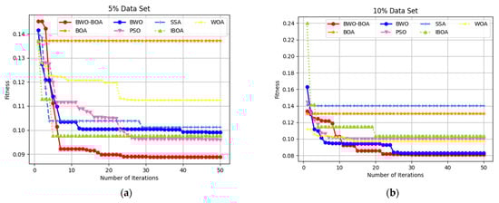 For the sake of judging the convergence speed and accuracy of the BWO-BOA in the binary classification, Figure 5 shows the fitness changes of different algorithms in the 50 iterations of the four datasets. It can be seen in Figure 5 that the fitness of the BWO-BOA is not high in the first-generation iteration process on the 20% and 30% datasets, which indicates that the BWO-BOA has a strong search ability from the beginning. In the four datasets, the fitness of the BWO-BOA is lower than the other algorithms, and it is the largest difference from the original BOA, which shows that the BOA combined with the movement strategy of BWO can reduce feature redundancy, while ensuring high classification accuracy. It proves that the BWO-BOA can well integrate the characteristics of the BOA and BWO and play a good role in binary classification.