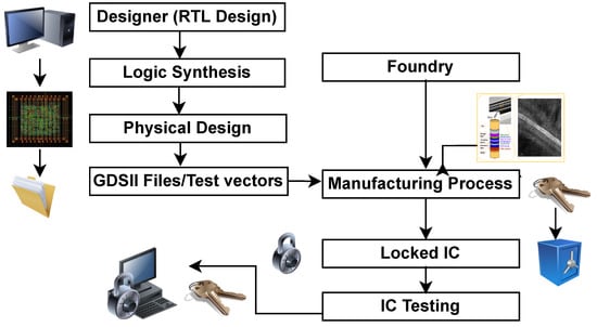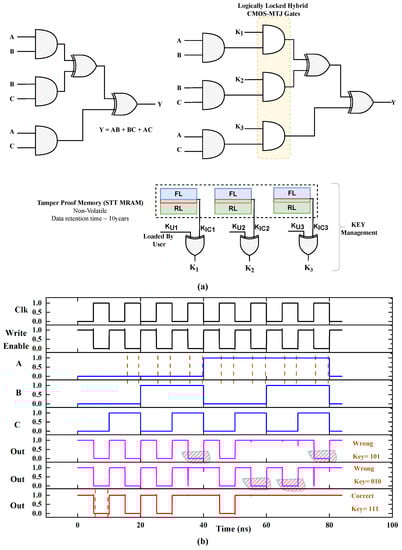In the last two decades, unprecedented growth in embedded systems has globalized custom integrated circuit (ICs) design. The cost of creating and maintaining the cutting-edge facilities required to manufacture these devices has increased dramatically as technology has advanced. As a result, many design companies have gone fabless, heavily relying on untrusted and unaffiliated foundries to fabricate their ICs. This results in hardware security concerns and financial losses, as an unreliable foundry can lead to counterfeiting, reverse engineering, IC overbuilding, hardware Trojan insertion, or IP piracy [1,2]. Recently, advancement in various emerging technologies (spintronic devices, memristors, carbon nanotubes (CNTs), nanowire FETs (NWFETs), etc.) has played a vital role in improving the notion of beyond-CMOS applications. For instance, using spin as a state variable instead of charge for logic operations [3] and several other emerging spintronics phenomenon-based applications [4] have shown great potential in recent research. The general prospect of utilizing various spintronics phenomena for security is discussed in [5]. In the context of hardware security, logic locking is one of the promising obfuscation methodologies for next-generation hardware security [6]. Logic locking protects ICs from overbuilding and IP piracy by inserting a key along with the primary inputs to drive the design. A correct key ensures the functionality of the design, while the wrong key corrupts the functionality. The key is stored on the chip’s tamper-proof memory for life and remains there even if the power is removed [7]. Figure 1 shows the basic overall flow of IC design in system-on-a-chip (SoC) design. The idea is to use a specialized foundry to insert a logic-locking block during manufacturing to create a locked netlist. More details about key storage and protection are discussed in Section 3.1.