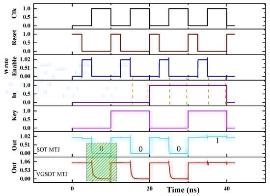 Figure 2 shows a logical implementation of the AND/NAND gate based on a hybrid CMOS-MTJ approach. The gate can be used in the logic-locking mechanism for hardware security applications. The MOS logic consists of NMOS transistors MN11-MN13. Two complimentary three-terminal MTJs are present in both branches of the PCSA. A reset signal is used to reset the MTJs to their default states. The write enable signal should be HIGH to write the MTJs with the key values. The write enable signal should be high when: (1) the clock pulse is LOW and (2) the reset signal is not HIGH. The reset path, read path, and write path of MTJs are highlighted in the circuit diagram. Figure 3 shows the logical AND operation obtained for the schematic of Figure 2 for both the VGSOT- and SOT-based MTJs for comparison. The fall time is more for VGSOT-MTJ, which is highlighted in the figure. The dotted region indicates the read interval for the logic state. Table 1 contains key parameters set during electrical simulation. Parameters such as Gilbert damping coefficient, saturation magnetization, etc. are MTJ technology parameters that depend on the material composition and the device parameters such as oxide-layer and free-layer thickness. AFM dimensions are masked and process design parameters can be adjusted. During process-variation simulation, the reference-point data must be selected so that the introduced deviation lies between the allowed range of operation in the compact model. The testing of parameters is thus limited by the degree of sophisticated modeling of the compact model. A more realistic and scaled compact model will therefore allow a better logic-locking system using MTJ devices.