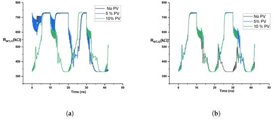 Figure 5 shows the transient variation of and of the logic-locking block under the different PV values. A more significant deviation in the resistance value of MTJs due to PV can cause incorrect operation; thus, the tolerance to device imperfection needs to be considered. Table 3’s data is taken from [20], which compares critical parameters for traditional SOT MTJ and VGSOT-MTJ. Thus, VGSOT switching requires less current and energy, but has more delay than traditional SOT MTJ. This delay in switching characteristics may cause a significant challenge in designing logic-locking blocks when operated in high-speed digital circuit operation. Thus, in this work, we focus more on analyzing the VGSOT-MTJ for high-speed circuits by using some standard circuit tests mentioned in Section 3.2 and Section 3.3.