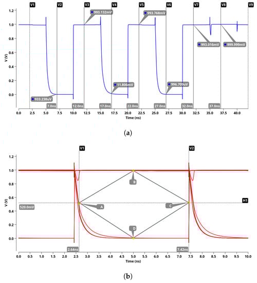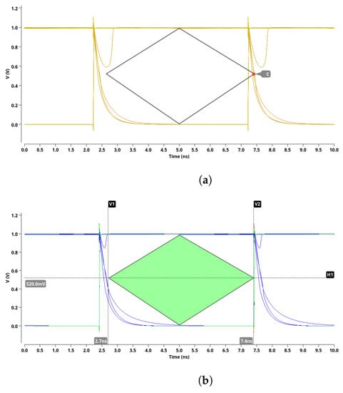 In this work, we perform an eye-diagram analysis to check the quality of the signal in high-speed digital transmission. The logic-locking block must perform satisfactorily in high-speed transmission to ensure proper operation. In the eye diagram test, the signal is split into sections, which are overlaid on top of each other, giving information about the distribution of the timing of the transitions between the Low and High levels. Eye Diagram analysis helps keep track of some crucial parameters such as signal duration, synchronization with the system clock pulse, noise effect, undershoot and overshoot, etc. If any of the parameters are degraded, the eye-opening is affected and, thus, eye-mask tests become difficult to perform. In Figure 6a, the one-cycle operation of the logic-locking block is split into several sections with a unit interval (UI) of 5 ns to capture the transitions properly. V1 (at 2 ns) represents the start of the interval and V9 (at 42 ns) represents the end.
