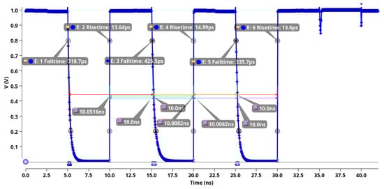 Transient measurements are critical in evaluating circuit designs. In Table 5, the transient measurement data are tabulated where 20% and 80% thresholds with respect to the baseline and top line are used. Electrical simulations are performed for the five cases, and important transient parameters are calculated to evaluate the performance of the logic-locking block. Due to the parameter variation, we observe a slight variation in some of the transient behavior, indicating that the selected MTJ can show tolerance to a certain extent for any practical applications. Figure 8 shows the transient capture of the data for Case 2.