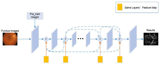 (1) We improve the U-net structure by passing different layers of feature maps to each other to meet the requirements of fundus image detail feature extraction. Benefiting from this improved network structure, network pruning can also be used to improve the segmentation speed during the process, and the network will automatically fit the capabilities of the hardware.