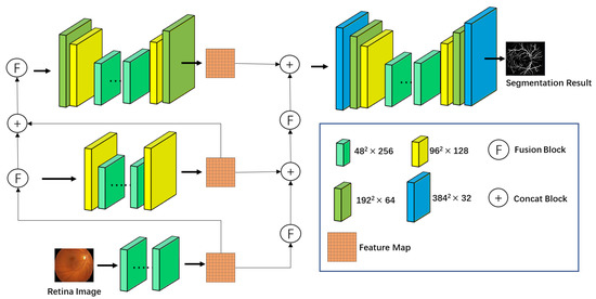 Vessel segmentation methods based on deep learning.The traditional machine learning segmentation methods are easy to implement, but their generalization ability is insufficient. Therefore, the results of traditional methods are usually worse than desired. With the facilitation of deep learning in computer vision, it has also achieved fruitful results in medical image segmentation. In 2015, Long et al. [8] proposed a Fully Convolutional Network (FCN) and made a breakthrough in segmentation. Since then, image segmentation using convolutional neural networks has gradually become a trend. Ronneberger et al. [2] proposed U-Net with excellent results for medical image segmentation. U-net follows the encoder–decoder structure and can be trained end to end. During the segmentation stage, U-net obtains lots of semantic features, which lead to state-of-the-art performance. Wang et al. [9] proposed the fusion net to divide retina images into easy and hard regions by combining attention networks and U-net, in which the two different regions are processed by two U-nets separately. Wang et al. [10] proposed a two-channel U-net network for retinal vessel segmentation. In the two-channel U-net network, one branch uses a large kernel to acquire spatial information and the other branch acquires the content feature of the retina image. Yue et al. [6] proposed an optimized U-Net model. The authors added multiple input layers into the traditional U-net model in order to learn rich details from medical images. Ma et al. [11] proposed a novel coarse-to-fine Optical Coherence Tomography Angiography (OCTA) image vessel segmentation network (OCTA-Net). The network generates an initial map of vessel location information by the coarse segmentation module and uses the refine segmentation module to optimize the shape/outline of tiny capillaries in fundus images.