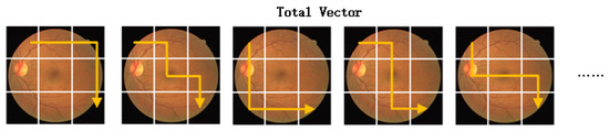 Specific vectors are selected as Figure 4, and these routes are chosen randomly from the top left corner to the bottom right corner, where equation represents the output feature vector. We take 2D retina images so the value of m is taken as 5. The loss function is shown as Equation (8):