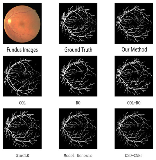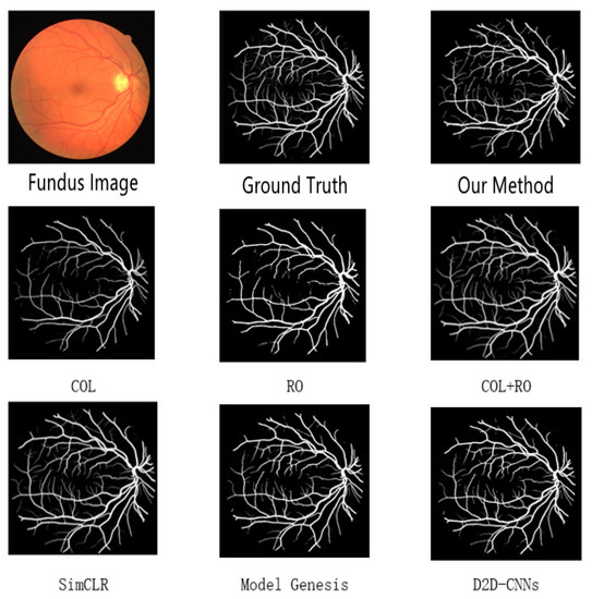 The COL [21] and RO [22] methods have the worst segmentation results since the single-task self-supervised learning task does not learn enough features when processing unlabeled data. The combination of COL [21] and RO [22] tasks showed a significant improvement over the single task, which shows that using a combination of tasks can improve the segmentation accuracy. SimCLR [23] has an improvement in accuracy, but is inferior to our method for capillary processing due to the existing details of vessels in fundus images.