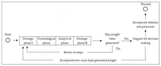 When we analyze the phases of a Big Data project according to the perception of some authors (Table 5), we find that there is no consensus on the stages or phases that cover the project. For Mousanif et al. [] the flow of a Big Data project is linear, starting with the elaboration of the global strategy as a form of planning, followed by the implementation stages and, finally, with the post-implementation stage. When presenting a holistic map for the implementation of Big Data projects, Dutta and Bose [] presented a framework with the phases of strategic basis, data analysis, and implementation.