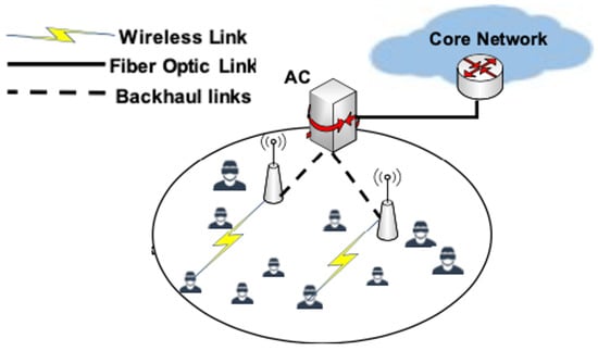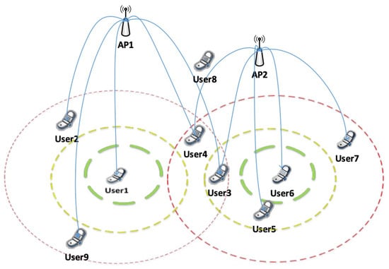In the previous subsection, we analyzed in detail the impact of our caching strategy and the perceived need to obtain the content in advance based on VR user behavior on AP association, due to the variation in signal strength, the length of the reception distance, and the signal attenuation caused by the blocking of environmental factors, such as buildings or trees in the actual scenario, combined with dense AP deployment. As a result, the transmission rate between each AP relative to the user is not the same. As shown in Figure 4, the distance between the user and the AP determines the strength of the signal they will receive under certain conditions of transmitting power and signal interference, so it can be seen that the distance between the AP and the user will be a key factor in determining the user’s download delay.