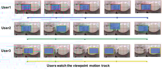 As seen by the k-nearest neighbor classification (K-nearest neighbor, KNN) method used in the study [24], the correction regarding the value of the motion-based prediction is made with reference to the viewpoints of the N other users who are closest to the motion-based predicted viewpoints, while neglecting to consider that similar behaviors will exist between users. Thus, if the user’s behavior is pre-projected, the user’s behavior is very different from the N users (theoretically, each person is special, then each user produces a different VR video viewing behavior), and based on this situation, then using the nearest N users’ viewpoints as a reference and thus correcting the motion-based prediction results will cause greater bias in the predicted conclusion values. Some studies [25] have shown that some of the viewing behaviors of different users in a virtual environment are similar when watching the same VR video. From the above analysis, it can be seen that for the perception of the view block and the user’s viewing behavior, we then use the user’s video viewing behavior habits within a certain time window as a reference. Figure 5 shows the characteristics of users’ viewing behaviors. The prediction of users’ viewpoint behavior is based on the historical trajectory of users’ viewing behavior, and then the prediction of users’ viewpoint is modified based on the similarity of movement among users. The following is the detailed methodology.