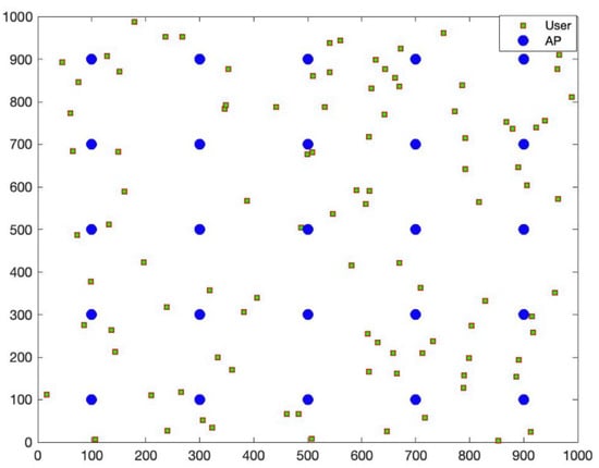 In this section, the numerical simulation software is used to further validate and analyze the algorithm. We construct simulation experiments based on the network scenario described in Section 3.1 and build the network topology by parameter settings. In order to verify the comparison of user behavior-aware AP association algorithm and user load balancing proposed in this paper, the current algorithm performance is analyzed based on the average delay comparison, user behavior-aware comparison and AP load of each algorithm. This section first constructs a regular area with a dense local deployment of APs and a large number of randomly and uniformly distributed users under a certain AC, as shown in Figure 6.