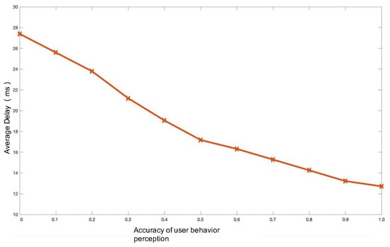 For the simulation data of the VR video source, we used the 4K resolution VR video from the dataset given in the study [27], where the number of tiles is 4 × 8. The user predicted in the simulation is randomly selected from the 48 users given in the study, and the first half of the user’s viewpoint trajectory is used for the behavior prediction. The second half of the user’s viewpoint trajectory is used to evaluate the performance of the user’s behavior prediction. According to the HWCA algorithm proposed in this section, it relies on the accuracy of user behavior perception, and also has a strong relationship with the perception period. As seen in Figure 8, the average user latency decreases with increasing prediction accuracy, thus indicating that the behavioral perception of user viewing attributes has an impact on accuracy and VR service quality assurance.