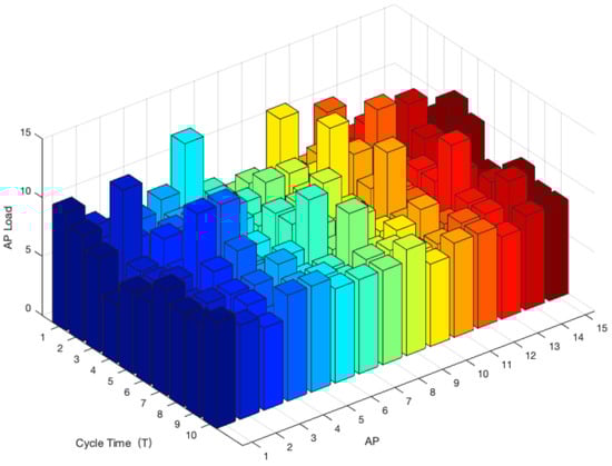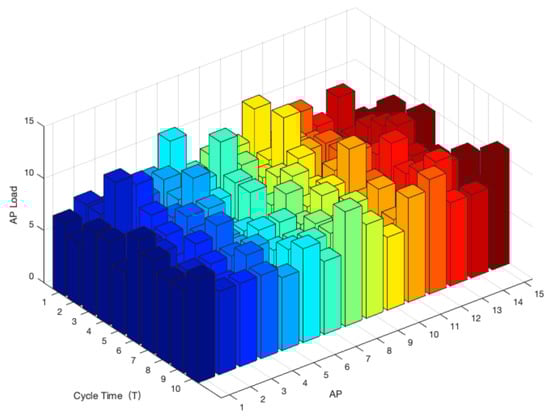 In Figure 11, the load of APs in our proposed HWCA algorithm can be seen, in which there is a pattern to follow. In the dimension of the AP load, the minimum value of each AP load is 6 and the maximum value is 10. In the 10 cycles, the load values of AP14 and AP15 are both large and the load levels between them are similar, and the load values of AP2 and AP8 are both small and the load levels between them are similar. The rest of the AP load values fluctuate around 8, and the load distribution is relatively average. Therefore, if the overall AP load is in a more balanced state, there may be an AP with a low load and an AP with a high load in each AP group, and an AP with normal load. The loads of different APs in the same cycle vary less, and the same AP does not vary much from cycle to cycle, perhaps due to the perception of user behavior caused by the correlation switching and thus the change. In general, there are no wasted AP resources and no AP overloads, and the loads of APs are relatively average.