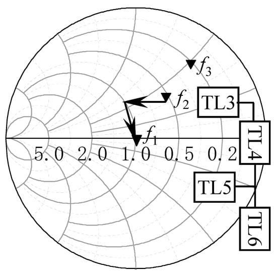 Thus, the impedance matching of the first frequency band is completed. At node A in Figure 1, the impedance of the second frequency band and the third frequency band are transformed to . After this, impedance matching for the second frequency band will be achieved.