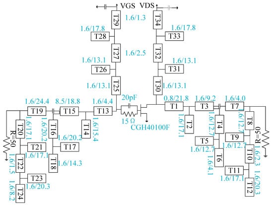 The power amplifier consists of a transistor, an input-matching circuit, an output-matching circuit, and a bias circuit. The bias circuit protects the DC power supply by blocking the RF signal. The design methods of bias circuits are quarter wavelength microstrip lines or broadband bias. In this paper, a quarter wavelength microstrip line is used to block three frequency bands at the same time. In this way, the input impedance of the bias circuit in all three frequency bands needs to be equivalent to the open circuit. That is, the input impedance goes to infinity. As shown in Figure 5, the biased circuit structure can achieve high impedance values in three frequency bands simultaneously. The characteristic impedance of the first microstrip line is 50. Based on the first frequency band , the electrical length of the microstrip line is 90 degrees. The characteristic impedance value of the second part of the microstrip line is 50. Based on the first frequency band , the electrical length of the microstrip line is also 90 degrees, but the load is an open circuit. In this way, the first open equivalent circuit of the frequency band is realized. The input impedance value of the third part can be obtained from Equations (6) and (7), and the characteristic impedance value of the third part of the microstrip line is 50. Based on the second frequency band , the electric length of the microstrip line can be obtained by Equation (8). The bias circuit is the DC input channel, which has a great influence on the efficiency of the power amplifier. Moreover, a parallel grounding capacitor is required to prevent self-excited oscillation of the circuit.