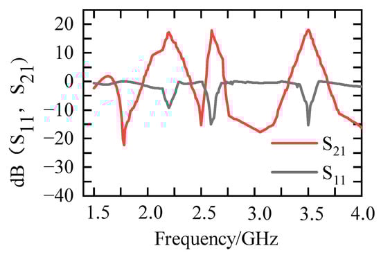 Figure 6 is the circuit structure diagram of the overall power amplifier. The input-matching circuit and the output-matching circuit adopt the same circuit structure, and the drain bias circuit and the gate bias circuit adopt the same circuit structure. The impedance values of both ports are 50 Ω. According to the proposed concurrent tri-band matching circuit, the output impedance and load impedance of the three frequency bands can be matched simultaneously. When the transistor gate voltage is set to 2.9 V, the drain voltage is set to 28 V. Through the test of software ADS, S parameters are obtained. As shown in Figure 7, The is less than −10 dB in the three frequency bands of 2.2/2.6/3.5 GHz and about 0 dB~0.5 dB in the other frequency bands. The reached around 15 dB in all three frequency bands. This shows that the reflection loss between the impedance matching of the three frequency bands is small, and the isolation between the bands is high.