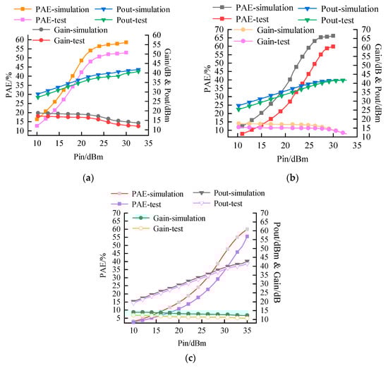 The test results and simulation results are shown in Figure 11. The power-added efficiency has a local maximum of 2.2 GHz, 2.6 GHz, and 3.5 GHz. The output power also reaches about 40 dBm, and the gain is about 10 dB. It shows that the designed power amplifier has suitable concurrent tri-band characteristics. The curves of power-added efficiency (PAE), output power (Pout), and gain as a function of input power (RFpower) are shown in Figure 11. According to Figure 11, the measured peak efficiency (PAE) of the power amplifier at the three frequency points is 61/67.8/56%, the maximum output power is 41/42/40.5 dBm, and the large signal gain is about 11 dB. There is a gap between realistic welding and ideal simulation. Due to the difference between the transistor model and the actual device, and the parasitic parameters in the welding of components such as resistors and capacitors, the measured performance is slightly worse than the simulation performance. Compared with the ideal environment of software simulation, the uncertainty of the packaging model and the fact that the 8 mm welding microstrip line is reserved for convenient welding will lead to a change in the measured results.