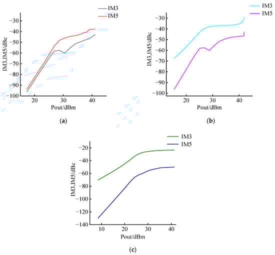 Third-order intermodulation distortion and fifth-order intermodulation distortion test results. (a) at 2.2 GHz simulation results. (b) at 2.6 GHz simulation results. (c) at 3.5 GHz simulation results.