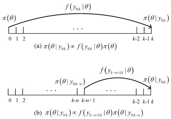 where n is the size of sliding window and is a positive integer, and is the likelihood function of unknown parameter with respect to the measurements from time to time k. Therefore, the posterior distribution can be obtained by computing instead of at each time, which is shown in Figure 1. Only n measurements are involved for computing the new likelihood function , while the whole measurement sequence is used to compute the original likelihood function . This can significantly reduce the computational complexity of the algorithm and enhance its robustness to jumping noise.