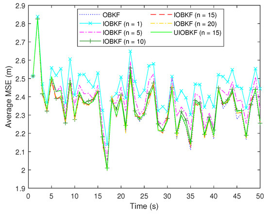 The true and estimated trajectories in a single trial are shown in Figure 3, in which n is the size of the sliding window. The average position MSEs of different algorithms over Monte Carlo trials are shown in Figure 4 and their mean values are provided in Table 1. It can be seen that the OBKF outperforms other algorithms, since the whole measurement sequence is used to estimate noise parameters. The estimation accuracy of the proposed IOBKF is related to the size of the sliding window. With the increase of the size of the sliding window, the estimation accuracy of the IOBKF gradually improves. When the size of sliding window is greater than 10, the estimation accuracy of the IOBKF for the state is close to that of the OBKF. In addition, when the size of the sliding window is fixed, i.e., , our IOBKF is superior to the UIOBKF, in which the weights of MCMC samples are not considered.