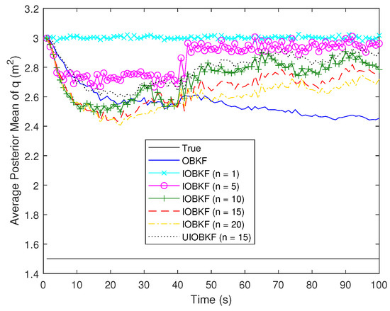 The results of the state estimation are not presented here because thay are similar to the results in Section 4.2.1. The estimation results of noise parameters q and r are shown in Figure 11 and Figure 12, respectively. It can be seen that for all OBKFs, the estimation accuracy of the measurement noise parameter r is still much better than that of the process noise parameter q. The main reason for this has been discussed in Section 4.1. Moreover, the process noise parameter q has less influence on the state estimation than the measurement noise parameter r. From Figure 12, the proposed IOBKF with outperforms the OBKF. It should be emphasized that when the measurement noise parameter r jumps, the estimation of process noise parameter q also jumps, but the true value of q is a constant.