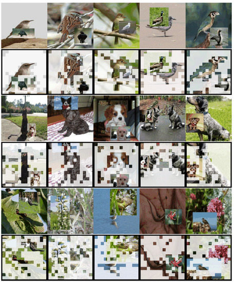 In Figure 6, we show the mixed images in lines 1, 3, and 5. To highlight which image patches have more influence on the classification results, we cover those patches whose influence on the final classification results is less than the threshold, and we display the covered images below the mixed images. It can be seen from the figure that most of the background is covered, while the object part is preserved. As with the object in the original image, the objects in the mixed-in patches receive attention, which means that the strategy of label assignment using the attention map is reasonable and efficient.