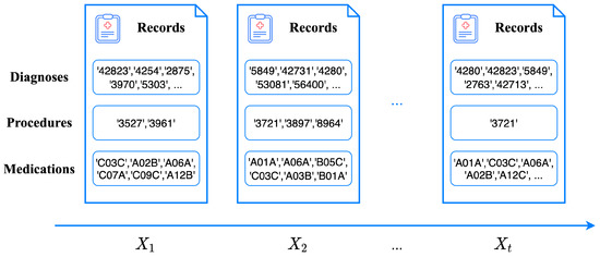 The records of a patient’s multiple visits can be regarded as a collection of time series. Meanwhile, the current diagnosis of patients may be influenced by their previous health conditions. For example, for patients with chronic conditions, such as diabetes or cerebral infarction, their current visits may be very similar to the historical visits. Moreover, stomach perforation and erysipelas may appear in a patient’s later visit when they have a peptic ulcer or chickenpox. Therefore, it is necessary to fully explore the temporal characteristics of the EHRs.