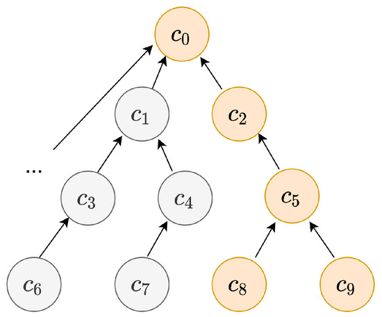 The structure of the ICD-9 encoding system is similar to the class hierarchy extracted from the medical ontology, and it can be represented by a directed acyclic graph structure. Specifically, the leaf node of the structure represents an ICD-9 diagnosis code or an ICD-9 procedure code, and the ancestor node represents the medical hierarchy with the specific classification significance of the medicine. Moreover, the structure of the medical ontology tree is shown in Figure 3, and each node in Figure 3 is described in Table 2. It can be seen that and represent the angina decubitus and prinzmetal Angina, respectively, and the nodes belong to the sub-classification of angina pectoris represented by and the general classification of ischemic heart disease represented by . In the training of Med-tree, all diagnosis nodes and their ancestors are regarded as tree nodes, and the relationship between each medical entity is regarded as the edge composition between nodes and their neighbors. Based on the edge connection of these medical entities, the medical ontology tree is constructed. Meanwhile, due to the different medical concepts of diagnosis and procedure, the diagnosis ontology tree and the procedure ontology tree are constructed, respectively.