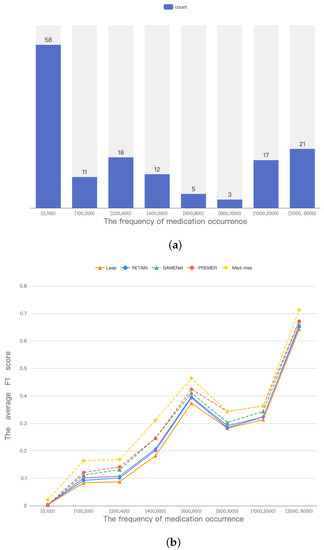 Due to the particularity of EHRs, the occurrence frequency of drugs may be different, so it is difficult to recommend drugs with low frequency during medication recommendation. Moreover, the proposed model could mitigate the influence of different frequencies of medications by constructing the medical ontology tree and the memory bank. Figure 6a counts the number of medications in different frequency bands, and it can be seen that 58 of the 145 medication types appear less than 100 times, while nearly 40 types are recommended more than 1000 times. The average F1 scores of medication recommendation results are calculated in different frequency ranges, as shown in Figure 6b, which indicates that the proposed model significantly improves the recommendation of less frequent medications compared with other methods. In addition, several frequency bands have higher average F1 scores because they contain more dedicated medications for specific diseases, such as hypertension drugs, diabetes drugs, etc.