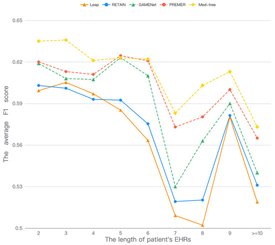 The comparisons of average F1 score recommended by different methods (Leap [43], RETAIN [21], GAMENet [22], PREMIER [44], and Med-tree) for EHRs with different temporal lengths on MIMIC-III datasets.
