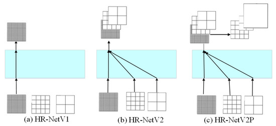 Most existing deep learning architectures first encode the input image into low-resolution representations and extract the image information. Then, they reconstruct the high-resolution representations from the encoded low-resolution representations. Wang et al. suggested [30] an HR-Net architecture that provides high-resolution representation throughout the process. The HR-Net providing high-resolution representation throughout the process has two key characteristics. The first is that all high-to-low convolution streams are connected in parallel instead of in series; the second is the continuous process to and from the information through the resolutions. There is a repetition of multiresolution fusions to boost the high-resolution representations with the help of the low-resolution representations and vice versa. As shown in Figure 3, it is a three-stage architecture, which begins with a high-resolution convolution stream, followed one by one by high-to-low-resolution convolution streams. Each stage consists of several components such as parallel multi-resolution convolutions, repeated multi-resolution fusions, and representation heads. There are three kinds of representation heads illustrated in HR-Net, as shown in Figure 4, i.e., HRNetV1, HRNetV2, and HRNetV2p. In HRNetV1, the representation of the output is from the high-resolution stream. The other three representations are ignored. In HRNetV2, the output is represented as high resolution after rescaling the low-resolution stream along with two more representations. In HRNetV2p, multi-level representations are constructed by downsampling the high-resolution representation output from HRNetV2 to multiple levels. HR-Net provides better accuracy than the FCN and SegNet modules; however, the resolution is higher throughout the process and has a higher memory cast and power efficiency. Therefore, the real-time realization of HR-Net with an edge device is not feasible.