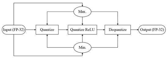 As shown in Figure 5, the quantization data flow diagram shows the conversion of a high-precision form into a low-precision form. The full-precision 32-bit float inputs into the quantizer, which provides an arbitrary low-precision output with different bit sizes such as 2-, 4-, 8-, or 16-bit. The input float tensors first go to max and min operations; afterward, they are fed to the dequantizer operations. Finally, an arbitrary bit results as the output from the dequantizer. The needless conversion to and from the float is eliminated in the next stage after the conversion of the individual operations. Numerous quantizer and dequantizer operations are required in the presence of consecutive sequences of floating equivalents. At this stage, pattern recognition operations are involved, which allow for the cancellation and removal of each other. This could be applied on a large scale to the models, where all operations have quantized equivalents, and offers a graph where all of the tensor calculations are performed in a quantized bit without having to convert to floating values.