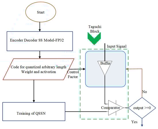Figure 6 shows a schematic flow diagram of the proposed sub-optimal QSSN, which involves quantization, training, and finding suitable quantization bit sizes with a fixed range of accuracy using the Taguchi method. First, the encoder–decoder semantic segmentation model with full precision is quantized with a bit length of b-bits, i.e., 16, 8, 4, or 2. The bit size of the proposed QSSN is assumed as a controlling factor for one input into the Taguchi block. After the quantization process, the resulting architecture, i.e., the QSSN, goes to the training block and evaluates the accuracy. The output of the training block is the assumed accuracy and is used as one input for the comparator. The output of the Taguchi block is the required accuracy and is used as the other input for the comparator. If the output of the comparator is greater than or equal to zero it means that our requirement is satisfied and the bit size is accepted; otherwise, the bit size needs to be altered again.