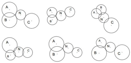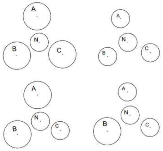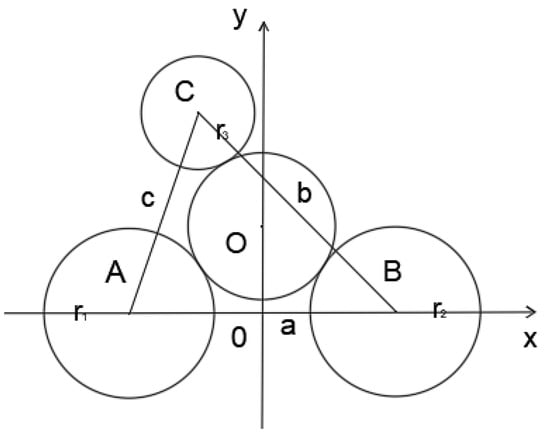 In Figure 1, the radii of the three circles A, B, and C on the known plane are denoted by , , and , respectively, with ; , , and . Taking the straight line of segment AB as the horizontal axis, and the midpoint of AB as the origin, a rectangular coordinate system is established, with point C falling on the upper half plane of the rectangular coordinate system. Suppose , , and . Let and r be the center and radius of the circle O to be solved, respectively. Then, C can be determined by the following equation set (note that ):