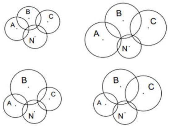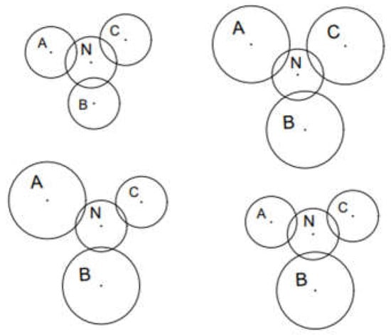 In Figure 2, N is the center of the circle. The nodes A, B and C are far apart, resulting in very large coverage holes. A mobile node is set at the center of the common circumscribed circle of the three nodes. Although it does not overlap nodes A, B and C, the mobile node patches the coverage holes to the maximum possible extent. In addition, since the distance between nodes A, B and C exceeds the communication distance, the mobile node increases the communication coverage of nodes A, B and C, and enhances the connectivity of communication.