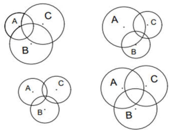 In Figure 4, two nodes A and B intersect each other, and the other node C has no overlap with A or B. The sensing ranges of nodes A and B cover each other, resulting in a large coverage hole. A mobile node is set at the center of the common circumscribed circle of the three nodes so that the position of the mobile node can maximize the patching of the hole.