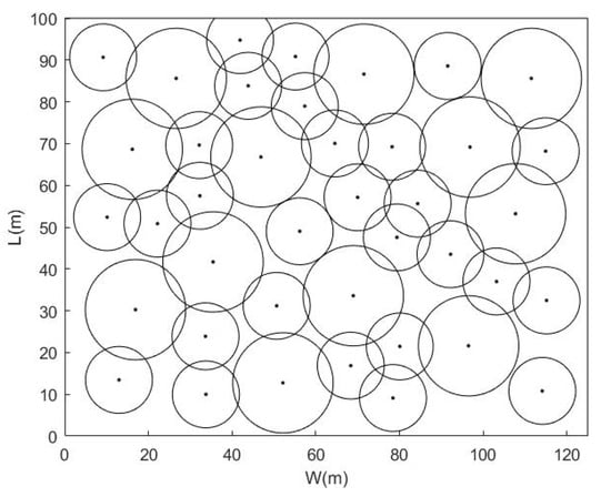 The detection area is of the size 125 m × 100 m. A total of 25 static nodes were deployed randomly inside the area, . The nodes fall into two categories. The sensing radii of the two types of nodes are and , respectively; the communication radii of the two types of nodes are and , respectively. These radii satisfy , , and . The sensing radii of the nodes are and . The communication radii assure that the nodes within the one-hop range can exchange information. The center of each circle represents the coordinates of a node. The area enclosed in the circle indicates the coverage of the WSN. The types and sensing radii of the mobile nodes are the same as those of the sensors with a sensing radius of . There are a total of 15 sensors. Simulation experiments were carried out to verify the proposed method. Figure 7 shows the coverage of the static nodes. The coverage was calculated to be 62.46%. There are 27 potential coverage holes in the detection area, which is larger than the number of mobile nodes that can be used.