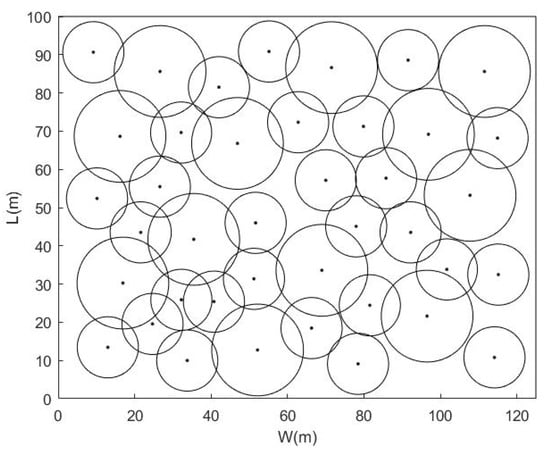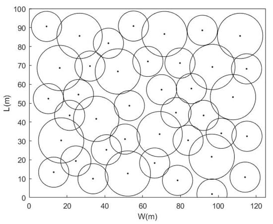 Suppose the rectangular detection area A is divided into m × n grids. A total of N static sensors are randomly deployed in the area. The static nodes fall into two categories: the nodes with a large sensing radius , and those with a small sensing radius . The radius of the former nodes is 1.5 times that of the latter nodes. The latter nodes are selected as the movable sensors that patch the coverage holes. The communication radii of the nodes with a large sensing radius and those with a small sensing radius are denoted by and , respectively, and , , and . The communication radius length between sensor nodes is twice the sensing radius , ensuring that sensors can communicate with each other. The communication graphs between the sensors are connected. Each sensor can obtain the information (e.g., position) of other sensors.