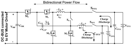 Considering the diverse vehicle driving settings, widespread voltage matching and decoupling of real and reactive power are crucial. These can be effectively ensured with the bidirectional DC–DC converter. Drawbacks in the operation of conventional BDCs are reported in the literature [16,17] from different viewpoints, although this paper does not aim to address them. Previous studies proposed several isolated and non-isolated bidirectional topologies to improve dynamic performance, gain, efficiency, and operability of BDCs for energy storage and renewable applications. In [18], a bidirectional DC–DC converter for power decoupling in a distribution system with a PV system and electric springs was investigated. A bidirectional DC–DC converter used to regulate the charging current in a bidirectional EV charger is discussed in [19,20]. These operate with isolated and non-isolated circuit arrangements. Another major benefit is reduction in volume, weight, and cost of the charger. In this context, several topologies of bidirectional converters specifically applied to electric vehicles have been investigated and reviewed [21]. A two-phase interleaved bidirectional DC/DC converter was studied in [22]. A circuit configuration with the aim of an increased voltage conversion ratio was proposed in [23]. In [24], a dual active bridge bidirectional converter for enhanced power range for an ultracapacitor was designed. A multi-port concept for a bidirectional power converter with a battery/supercapacitor was extensively simulated in [25]. A bidirectional DC/DC converter with dual-battery energy storage for a hybrid electric vehicle system was developed in [26].