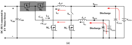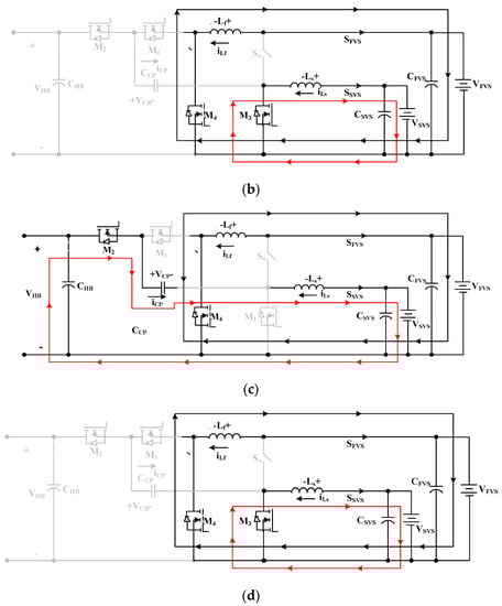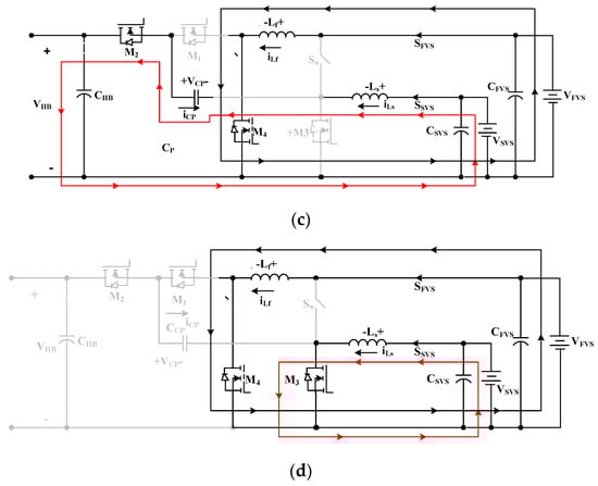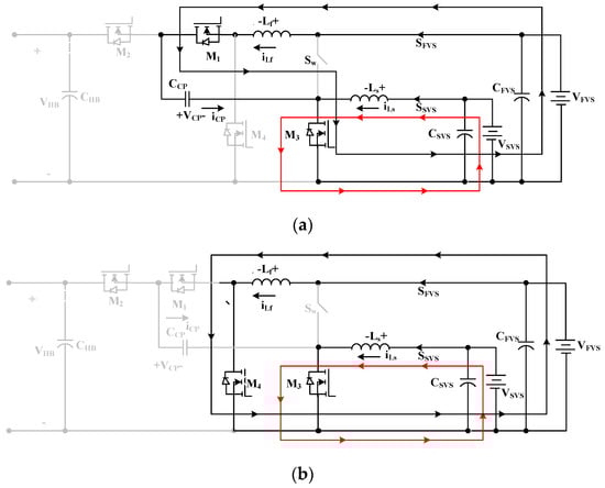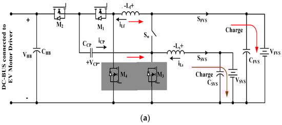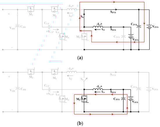 Switches () are turned ON. Dual low voltage sources () provide energy to connected loads and the DC-bus, as shown in Figure 3a. M3 and M4 switches on the bottom side are controlled by active switching with a 180° phase shift angular position, whereas M1 and M2 switches on the top side are synchronous rectifiers.