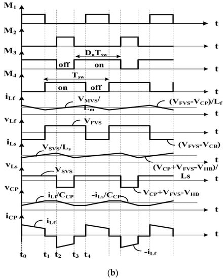 Four circuit stages are featured in Figure 4. Dual-sources low voltage powering mode steady-state waveforms with a duty ratio greater than 50%, as illustrated in Figure 3b, and the operation, can be stated briefly as follows.