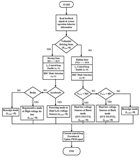 Figure 10 shows the block diagram of the feedback-loop control technique, which comprises choosing a vehicle strategic level and mode of BDC to govern pulse width modulation switching schemes. Several operating modes of the BDC controller are depicted in Figure 11. As indicated in the closed loop controller architecture, the vehicular key level necessitates power demand (PDem), vehicle voltage, and power management units. They serve as input signals to BDC mode selection. Overall results of the power management units improve the utilization of voltage sources to meet the power train’s power demand, satisfying the requirements of the driver. In Figure 10 inductor currents, and are calculated and then compared to the reference converter currents. In this mode of controller operation, different driving states of power demand (PDem) and voltage sources (VFVS, VSVS) are used to determine the vehicle condition. Then, using an artificial neural network, appropriate current references- or are selected to control the power switches- Sw, M1, M2, M3 and M4. Pulse width modulation (PWM) switching methods transform the duty cycle into regulated gate signals for the active switches (Sw, M1, M4), and the BDC controller’s switch selectors (S1, S2).