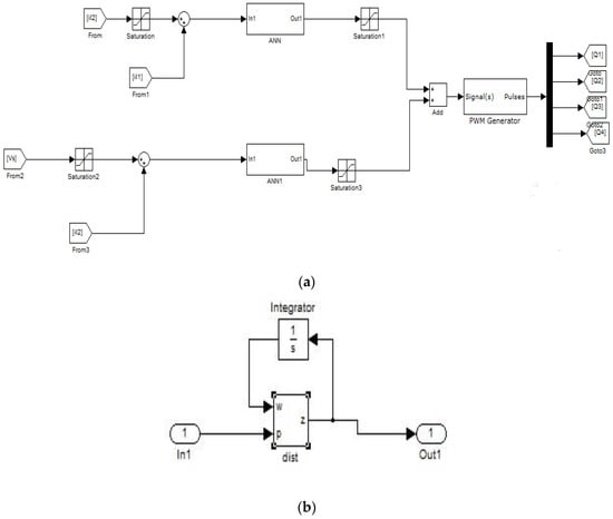 When the vehicle is in moving state (PDem > 0), the control loop s = 1 in the controller iLm is activated, and it operates in two modes: accelerating and braking, as seen in the controlled switches in Table 1. If both conditions are not met, it returns to the reassign mode to operate the very next perception of switching mode. Furthermore, while the vehicle is in a halting condition (PDem < 0), the control loop s1 = 0 in the controller iLa will work in two modes, buck and boost, as illustrated in the controlled switches in Table 1. Voltages VFVS (96 V) and VSVS (48 V) are used to perceive mode change in this halting condition. During boost mode, i.e., when VFVS is less than 96 V and , power flows from the VSVS to the VFVS. During buck mode, i.e., when VFVS is less than 46 V and , power flows from VFVS to the VSVS. If neither of these conditions is met, the system reverts to the reassign mode, which is used to process the next perception of mode switching. Figure 12a,b show the various steps in modeling of an ANN controller implemented in this research work.
