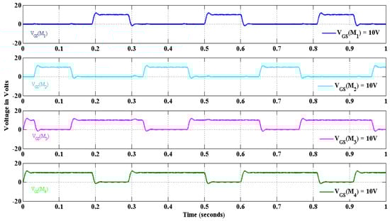 In regenerative mode, the motor’s kinetic energy is returned to the voltage sources. Regeneration energy can be more than the battery’s storage capability, wherein the additional energy will be used to charge the storage devices. On the higher side, active switching regulates the current through the inductors, i.e., M3 and M4 switches with 180° phase shift angle. However, the lower side switches- M1 and M2, act as synchronous rectifiers, increasing the converter’s conversion performance. This can be observed in Figure 5a.