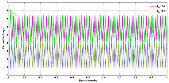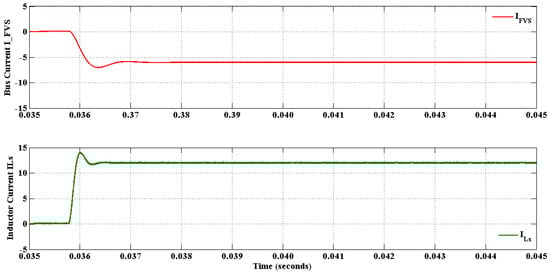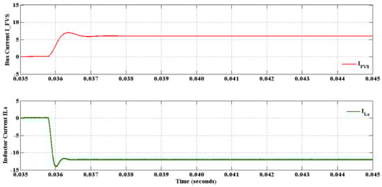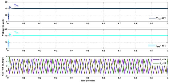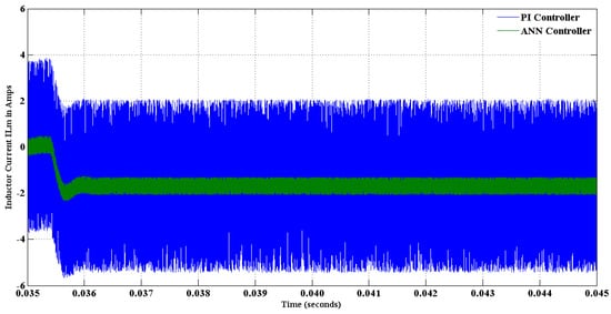 Figure 22 shows a comparison of output voltage in power sharing mode at low voltage, while Figure 23 illustrates a comparison of output voltage in DC-bus high-voltage regenerative mode. Figure 24 and Figure 25 show controlled current step variation in inductor currents in buck and boost modes of operation.