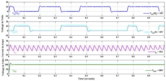 Figure 13 show the gate pulses delivered to switches M1, M2, M3, and M4, in powering mode and regenerative mode, respectively. Inductor currents and are shown in Figure 14 and Figure 15, respectively. Figure 15 illustrates inductor current and output voltage in DC-bus energy-regenerative mode at high voltage.