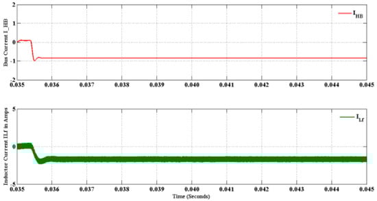 Using dual low-voltage sources, simulated waveforms–gate signals, inductor currents and output voltages during buck and boost modes are shown in Figure 16 and Figure 17, respectively. In Figure 16, the currents in the inductor are inverted from those in Figure 17. This validates bidirectional power to flow between the second and first voltage sources. Finally, all of the simulation results are consistent with the stable-state prediction study. Waveforms of regulated current step variations for the conceptual design in the high voltage energy-regenerative mode and the dual low-voltage sources-powering mode are displayed in Figure 18 and Figure 19, respectively. In order to transmit energy from the dual lower-side sources to the higher-side DC-bus, the current in the inductor and the higher-side current were adjusted, as illustrated in Figure 18. Negative current output waveforms are indicated in Figure 19. The power flow was effectively inverted.