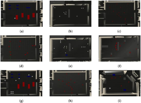The nine stages selected using Table 1 and Table 3. The captures are taken from Gazebo. The white and colored objects represent mobile and fixed obstacles. The full description of the nine stages can be found above, listed from (a) to (i). (a) Stage 1; (b) Stage 2; (c) Stage 3; (d) Stage 4; (e) Stage 5; (f) Stage 6; (g) Stage 7; (h) Stage 8; (i) Stage 9.