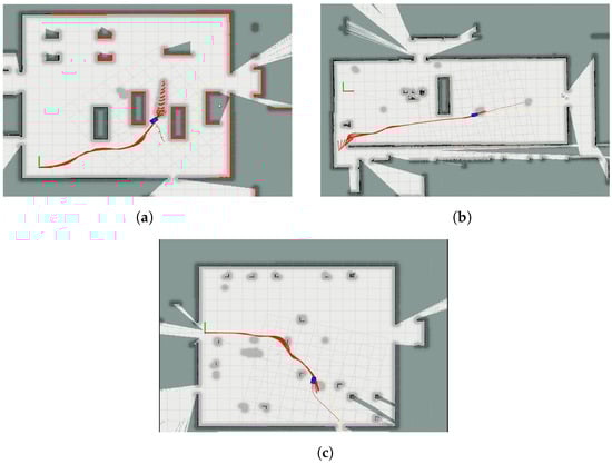 A view in Gazebo of how the robot moves in each of the nine stages with the consideration of a classical navigation algorithm provided by the ROS libraries can be found in Appendix A. The classical navigation algorithm (i.e., TEB planner) is currently used in many practical applications. As the simulation shows, there are many situations where the robot collides with obstacles or moves along unjustified trajectories, which consume time and space. Three such cases are shown in Figure 2 for illustrative purposes.